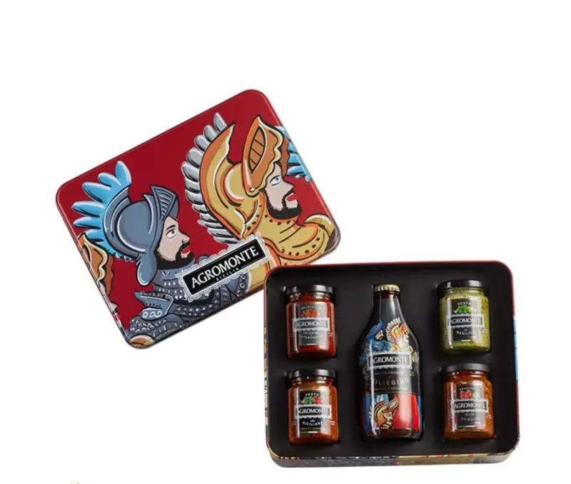 S Agromonte limenom poklon kutijom crvene boje, možete počastiti svoje voljene trenutkom autentičnog sicilijanskog okusa. Elegantna i živahna u svom šarenom dizajnu, ova kutija sadrži poseban izbor delicija spremnih pretvoriti svaki obrok u jedinstveno iskustvo. Unutra ćete pronaći bocu od 330 g slatkog i intenzivnog umaka od cherry rajčice, savršenog za donošenje jedinstvenih predjela na stol. Izbor upotpunjuju četiri različita Agromonte pesta ili bruschette, ovisno o dostupnosti. Idealni za obogatiti bilo koji aperitiv ili večeru autentičnim okusom tradicije. Savršena za dijeljenje s obitelji i prijateljima, ova kutija je idealan poklon za one koji vole dobru hranu i druženje!