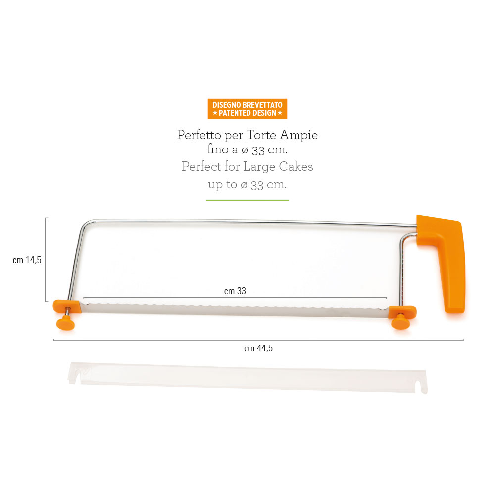 Praktičan alat za jednostavno rezanje kolača na slojeve ravnomjerno. Opremljen inovativnom oštricom od nehrđajućeg čelika, nazubljenom i naoštrenom, za postizanje veće preciznosti u rezanju. S prozirnim plastičnim zaštitnim premazom za dodatnu sigurnost tijekom skladištenja. Zahvaljujući bočnim urezima, oštrica se može podesiti na 14 različitih visina. Plastična ručka udobnog držanja i ergonomskog oblika omogućuje čvršće, udobnije i sigurno držanje osiguravajući precizan i pravilan rez.