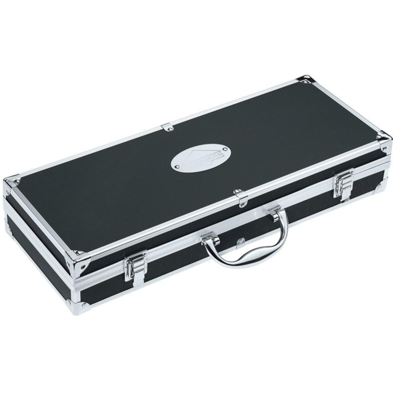 Pribor za roštilj od nehrđajućeg čelika u elegantnom kućištu od crnog aluminija. Traženje i prikupljanje pribora je prošlost jer se u ovom setu sve nalazi na jednom mjestu. Set sadrži vilicu, hvataljku, lopaticu, četku za roštilj, i štapiće za ražnjiće. Sav pribor je visokokvalitetno obrađen, funkcionalan i ima svoje mjesto u kovčegu.